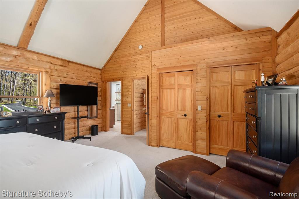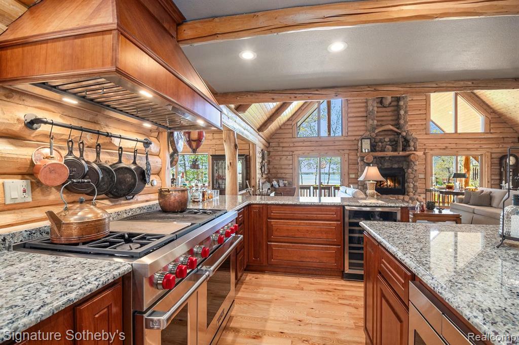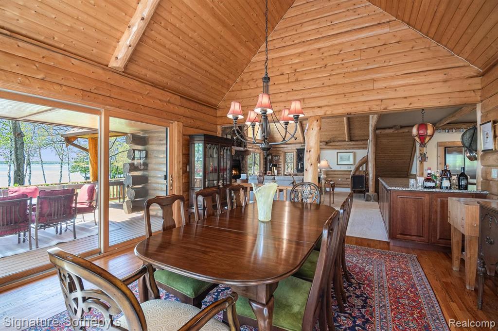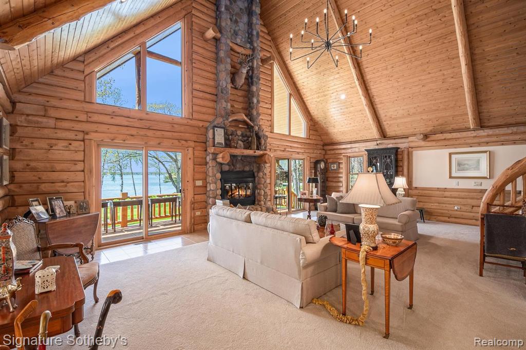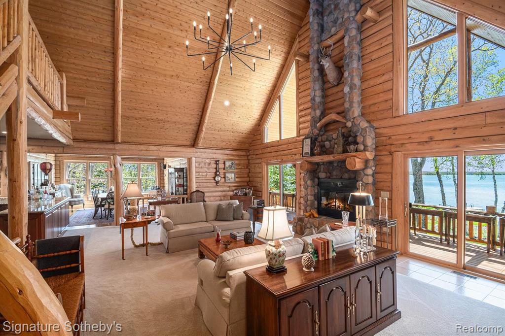 A grand welcome-meet craftsmanship where every detail tells a story and where lakeside living is elevated to an art form. As you wind down the 975 ft paved tree lined driveway, the vision unfolds of a one-of-a-kind log custom built masterpiece. It's rich Michigan-Native timber milled onsite with a detached 2 story 3-car garage, with plenty of storage for your vehicles, equipment and lake-life essentials . Upon entering a kitchen, worthy of a chef, with new custom cherry kitchen, granite countertops, massive center island and dual sided storage. Including built in Microwave drawer, French door SS Refrig., wine refrig.,48" SS Wolf range, double ovens, griddle, grill and Zephyr range hood. A 2-story Great room with floor to ceiling stone gas fireplace. The wraparound deck offers breathtaking lake views from Great room with oversized door walls and windows. Complete with vaulted ceiling in dining room. Primary bedroom on first level with spa like ensuite bath featuring oversized custom shower, cherry double vanity & Kohler fixtures. Second level offers bright loft bedroom, hardwood floors, double closets, w/updated full bath. Lower level fully refinished walk-out offers full kitchen, third bedroom in lower level w/fully updated new bath. Additional large family room with custom wood beams w/floor to ceiling stone fireplace for entertaining. Also included large storage room. Step outside this beautiful home and look upon 178 ft. of beautiful shoreline of all sports Grand Lake. Seller is offering a new roll-in L shaped dock w/oversized sundeck. Custom 18ft. circular fieldstone patio and firepit . New HVAC water softener, sump pump, updated electrical panels, and whole house Generac 24KW generator. Nothing left to do but turn the key, step inside and let Pure Michigan life begin!! All buyers to provide proof of funds. Min. 48 hrs. to show - listing agent must be present at all showings. BATVAI |