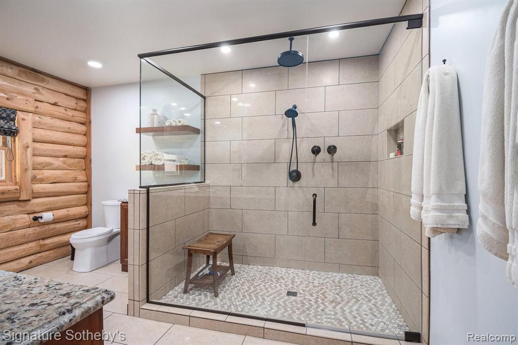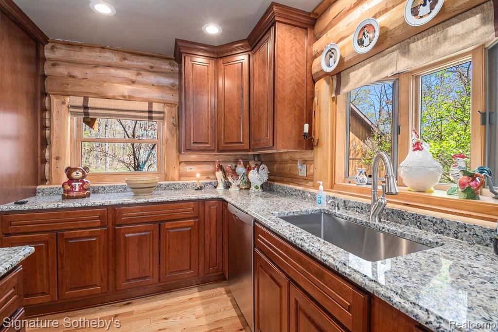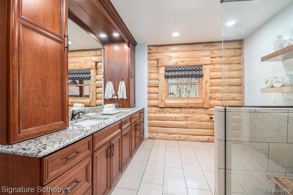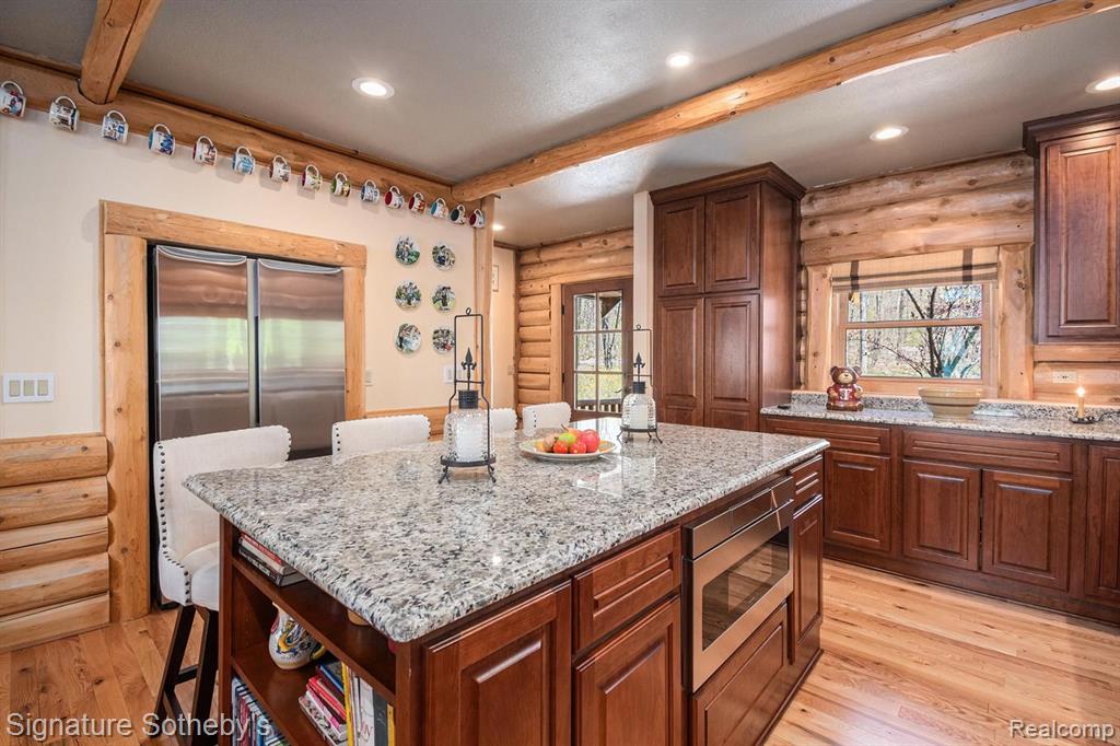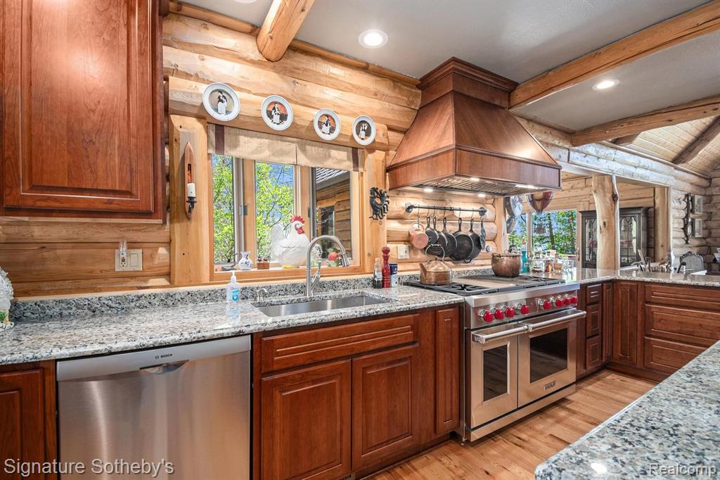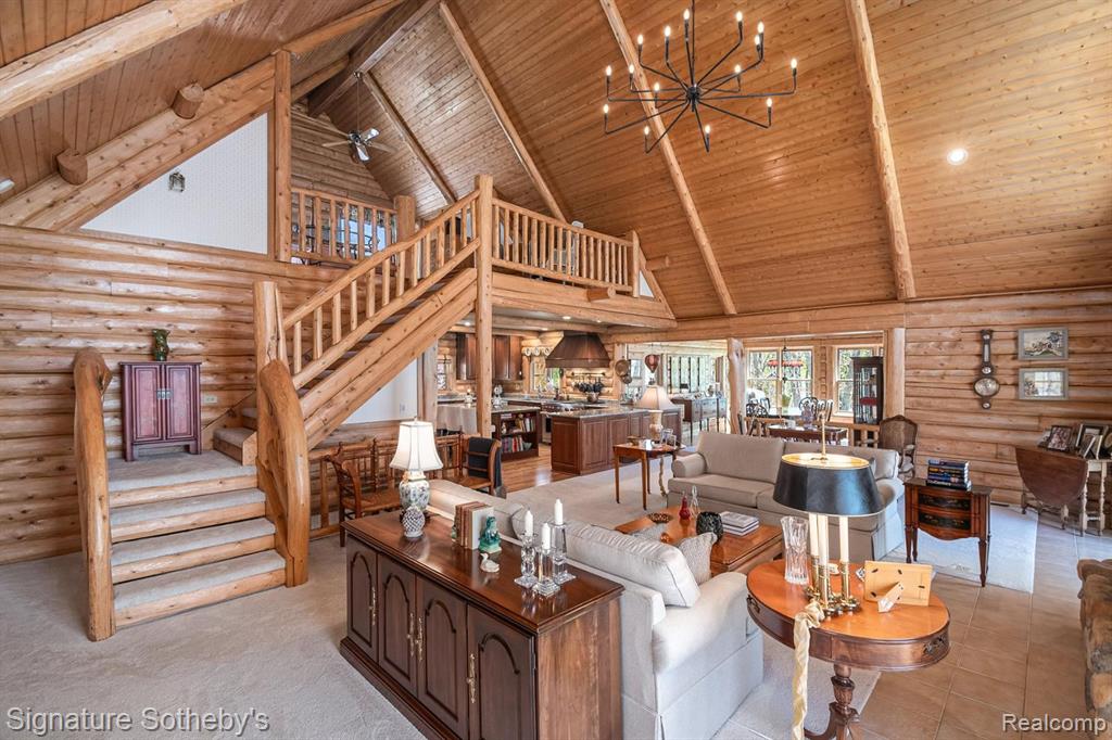 A grand welcome-meet craftsmanship where every detail tells a story and where lakeside living is elevated to an art form. As you wind down the 975 ft paved tree lined driveway, the vision unfolds of a one-of-a-kind log custom built masterpiece. It's rich Michigan-Native timber milled onsite with a detached 2 story 3-car garage, with plenty of storage for your vehicles, equipment and lake-life essentials . Upon entering a kitchen, worthy of a chef, with new custom cherry kitchen, granite countertops, massive center island and dual sided storage. Including built in Microwave drawer, French door SS Refrig., wine refrig.,48" SS Wolf range, double ovens, griddle, grill and Zephyr range hood. A 2-story Great room with floor to ceiling stone gas fireplace. The wraparound deck offers breathtaking lake views from Great room with oversized door walls and windows. Complete with vaulted ceiling in dining room. Primary bedroom on first level with spa like ensuite bath featuring oversized custom shower, cherry double vanity & Kohler fixtures. Second level offers bright loft bedroom, hardwood floors, double closets, w/updated full bath. Lower level fully refinished walk-out offers full kitchen, third bedroom in lower level w/fully updated new bath. Additional large family room with custom wood beams w/floor to ceiling stone fireplace for entertaining. Also included large storage room. Step outside this beautiful home and look upon 178 ft. of beautiful shoreline of all sports Grand Lake. Seller is offering a new roll-in L shaped dock w/oversized sundeck. Custom 18ft. circular fieldstone patio and firepit . New HVAC water softener, sump pump, updated electrical panels, and whole house Generac 24KW generator. Nothing left to do but turn the key, step inside and let Pure Michigan life begin!! All buyers to provide proof of funds. Min. 48 hrs. to show - listing agent must be present at all showings. BATVAI |